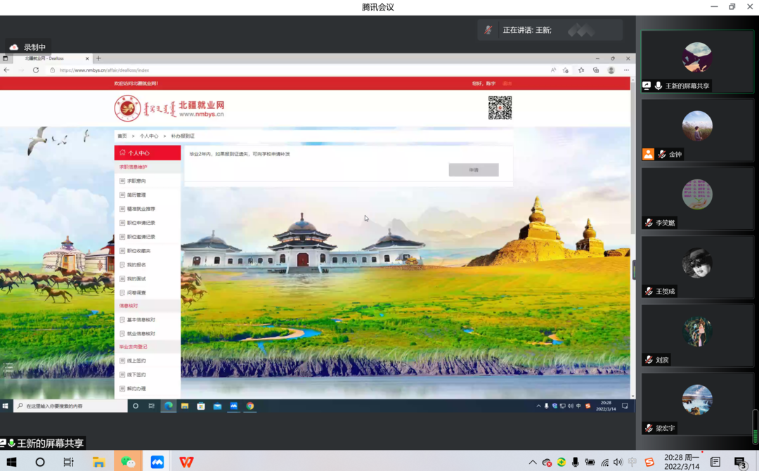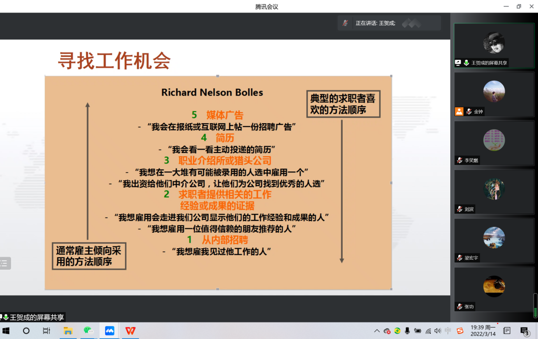 为贯彻党中央、国务院“稳就业”“保就业”决策部署,落实学校就业工作要求,推进威尼斯官网2022届毕业生就业工作,促进毕业生高质量就业,37000a威尼斯于2022年3月14日晚特邀请我校招生就业处就业市场部部长刘在青、招生就业处职业发展指导中心主任王贺成、招生就业处就业信息服务中心王新三位老师开展线上就业政策讲座,威尼斯官网党委书记七十三、院长乌云特娜、副院长侯友、全院教师及2022届毕业生参加讲座,讲座由学院党委副书记副院长张晓阳主持。