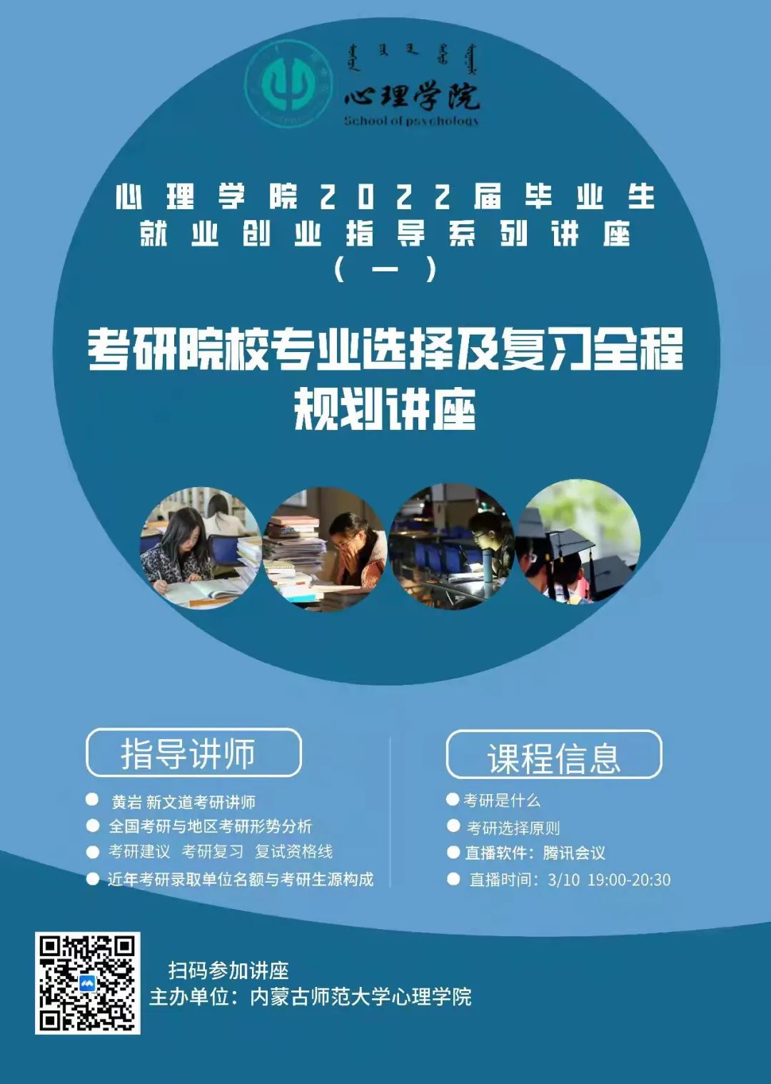 为丰富2019、2020级学生对考研的相关知识,激发学习热情、增强考研信心,37000a威尼斯于2022年3月10日晚19点开展了2022届毕业生就业创业指导系列讲座(一)——考研院校专业选择及复习全程规划讲座。