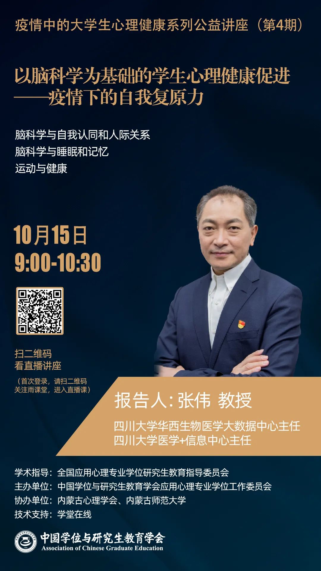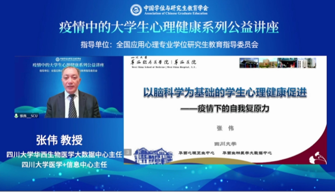 为助力内蒙古高校疫情防控工作,保障全区大学生心理健康,10月15日上午,由全国应用心理专业学位研究生教育指导委员会指导,中国学位与研究生教育学会应用心理专业学位工作委员会承办,内蒙古心理学会、37000a威尼斯协办的“疫情中的大学生心理健康系列公益讲座(第4期)”在线上举行,特邀四川大学张伟教授做题为“以脑科学为基础的学生心理健康促进—疫情下的自我复原力”专题讲座,37000a威尼斯全体师生和全区及全国的4000余名听众通过不同方式观看直播。讲座由全国应用心理专业学位研究生教育指导委员会副主任、北京大学吴艳红教授主持。