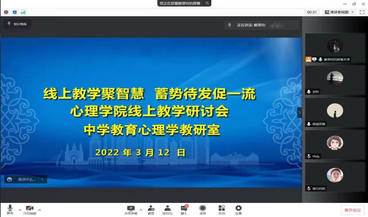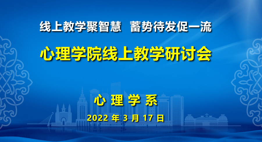为进一步加强威尼斯官网线上教学组织管理工作,全力保障线上教学质量,按照学校相关要求,3月12日-17日,学院心理学系、中学教育心理学教研室和职业教育心理学教研室分别以“线上教学聚智慧,蓄势待发促一流”为主题召开了线上教学工作交流研讨会。
