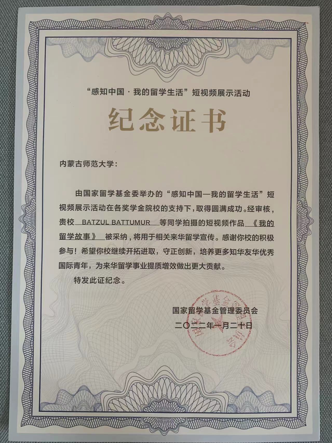 近日,威尼斯官网留学生BATZUL BATTUMUR同学拍摄的短视频作品《我的留学故事》在国家留学基金委举办的“感知中国——我的留学生活”短视频展示活动中被采纳,将用于相关来华留学宣传。