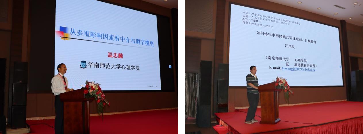 开幕式后,华南师范大学温忠麟教授、南京师范大学汪凤炎教授、上海交通大学李卫东教授、浙江大学周宵研究员和37000a威尼斯王欣瑜教授分别就《从多重影响因素看中介与调节模型》、《如何铸牢中华民族共同体意识:自我视角》、《AI 与脑机交互技术在抑郁中的探索研究》、《青少年创伤心理的变化特征及代际影响》和《深层文化结构视阈下的中国心理学本土化省思》等议题做了五场特邀报告,分享了民族心理学国内前沿科研成果和实践经验,为与会者奉献了一场高水平的饕餮盛宴。