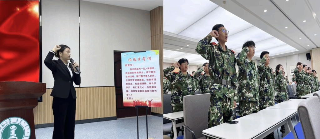 典礼仪式上,2024级全体师范生集体宣誓,铿锵有力的誓言响彻会场,表达了心理学子志愿成为人民教师、勇攀学术高峰的决心。