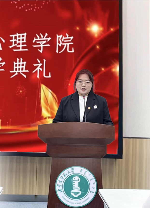 教师代表格根图雅以幽默风趣的方式围绕用心感受心理学的文化传承分享了自己对于学习和生活的见解,希望同学们用心感受百年心理学的文脉传承、汲取激励心理学人前行的力量,彰显内师人的家国情怀。她鼓励大家要独立思考,闯学术之路;自信专注,辟科研新径;笃行致远,担时代重任。