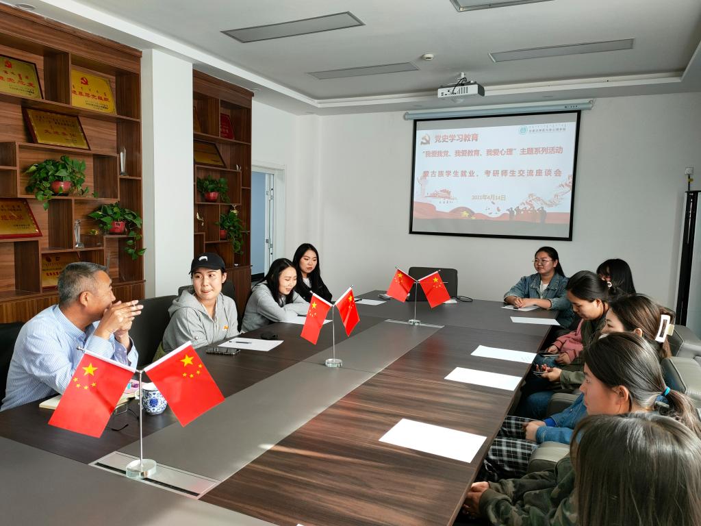 为扎实开展党史学习教育、推进“我为群众办实事”实践活动,贯彻落实党中央、国务院“稳就业”、“保就业”决策部署,积极推进威尼斯官网毕业生高质量就业,促进教育高质量发展,4月14日下午,37000a威尼斯党总支在学院楼B213会议室开展“我爱我党、我爱教育、我爱心理”党史学习教育主题实践活动——召开蒙古族学生就业、考研师生交流座谈会。党总支书记七十三、副书记张晓阳、学就办主任张金钟与2017级、2018级心理学专业学生进行交流座谈。
