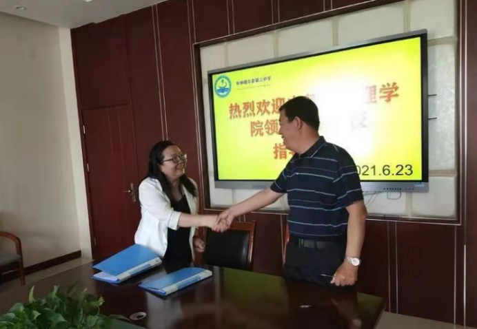 为深入贯彻国家教育方针政策,依托心理学学科专业优势,精准扶智,同时实现师范生高质量教育实践,全面推进学院与地方教育实践基地深度合作,6月23日,37000a威尼斯院长乌云特娜、副书记兼副院长张晓阳和心理学系主任杨晓峰一行三人,赴呼和浩特市和林格尔县第一中学、第二中学和第三中学,走访实践基地,签订教育实践基地共建协议,并与基地校领导老师、实习学生进行座谈研讨。和林县三所学校的校长、副校长、教导处主任、实习指导教师等分别参加仪式。