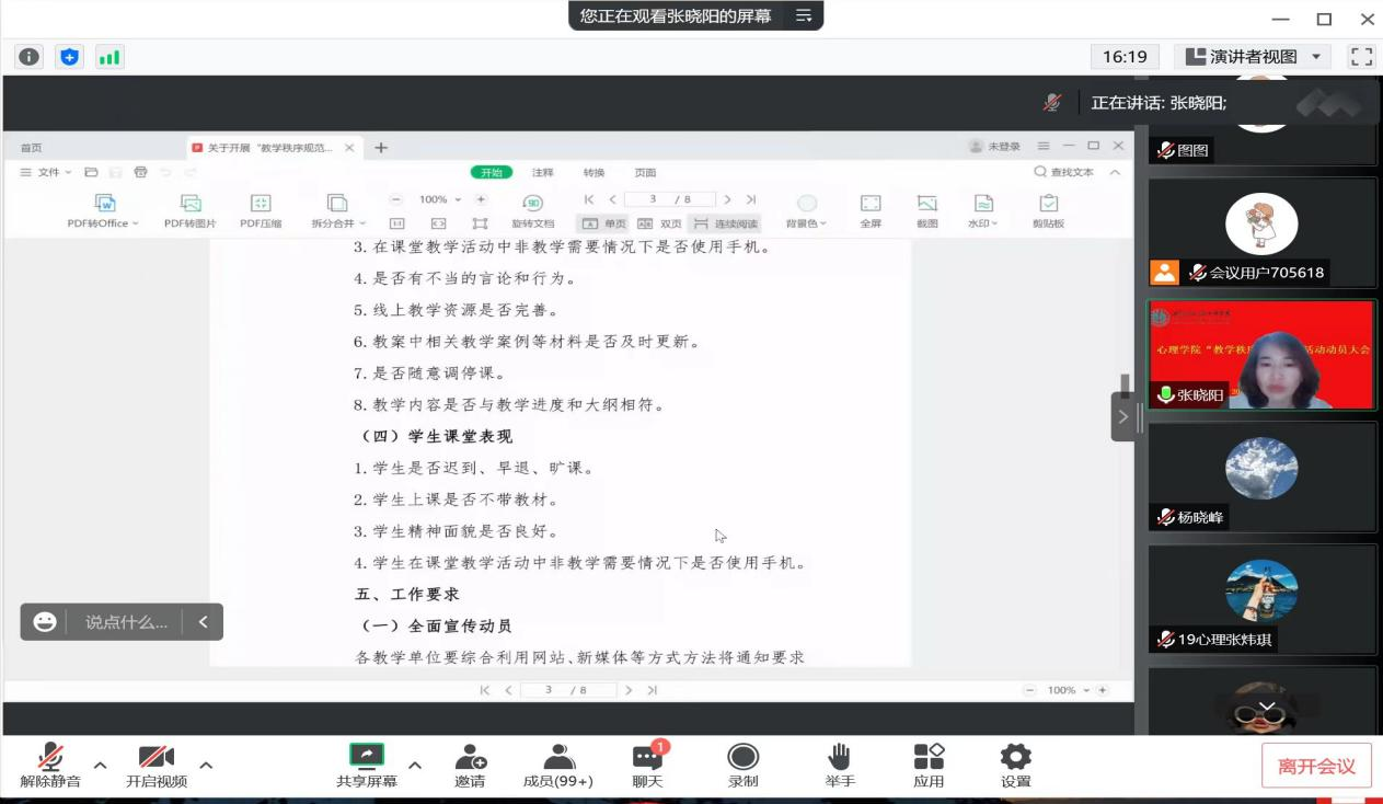 为进一步规范课堂秩序,培育优良教风学风, 9月5日,威尼斯官网召开 “教学秩序规范月”活动动员大会。院党委副书记、副院长张晓阳主持会议。心理学系主任杨晓峰,教务办负责人王朝力门以及2019级、2020级、2021级全体本科生参加会议。